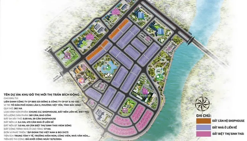 Dự án Việt Yên Riverside Bắc Giang đang là tâm điểm của giới đầu tư và khách hàng tìm kiếm nơi an cư lý tưởng tại trung tâm thị trấn Bích Động. Với quy mô 30,1ha, dự án do Công ty Cổ phần Bất động sản Sài Đồng và Công ty Cổ phần Đầu tư & Xây dựng TSG làm chủ đầu tư, được định hướng trở thành khu đô thị sinh thái kết hợp du lịch nghỉ dưỡng cao cấp, mang đến không gian sống xanh, thông minh và đầy tiềm năng sinh lời.